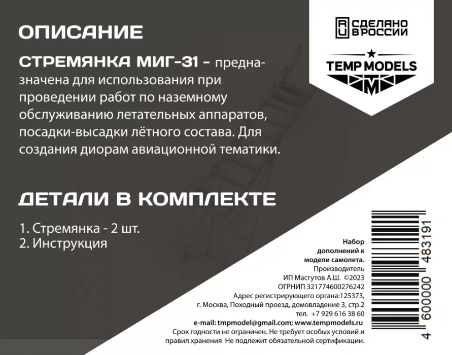 48319TMP СТРЕМЯНКА ДЛЯ МИГ-31 Temp Models в Иваново, купить в интернет-магазине, цены, фото