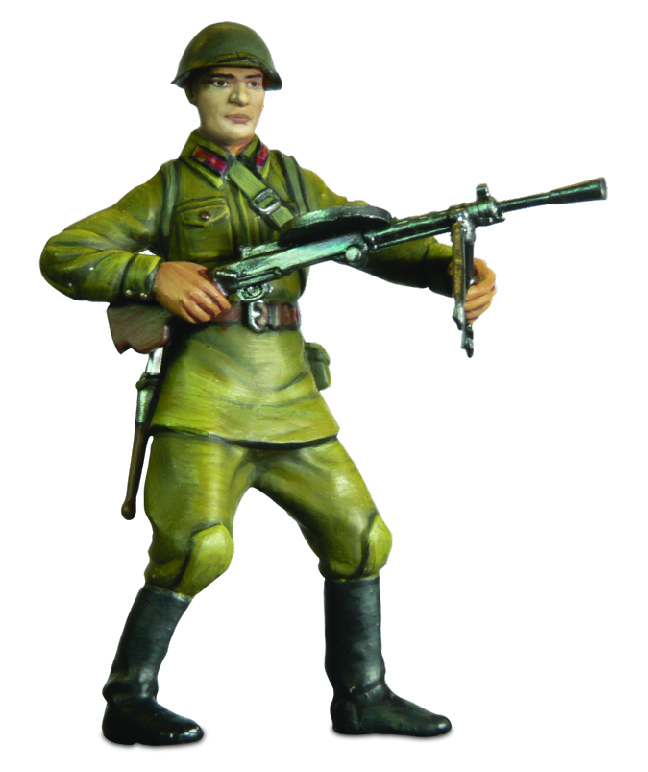 Набор из семи фигурок рядовых и фигурки командира Красной Армии в момент атаки, бойцы одеты в полевую форму на начальный период Великой Отечественной войны. Солдаты вооружены винтовками различных систем, ручным пулеметом системы Дягтерева и станковым пулеметом системы Максима.