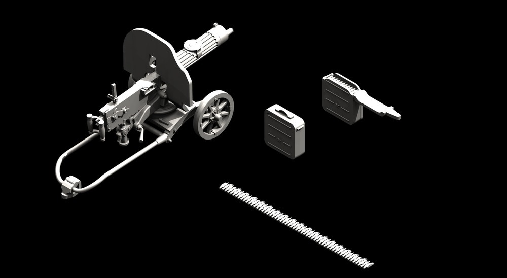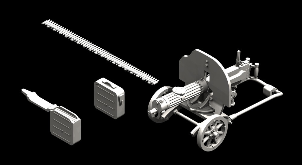 Детализированный сборный колёсный станок, проработанная казённая часть, кожух ствола с продольным рифлением, прицел, короб с лентой патронов.