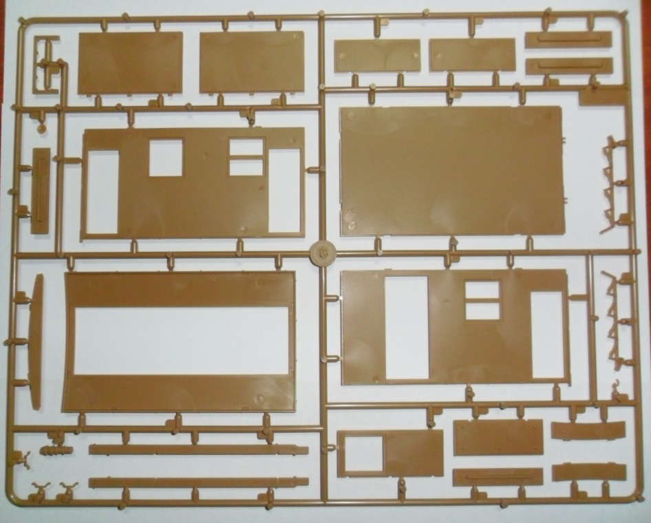 Детализированный гусеничный привод, пластиковая наборная гусеничная лента с прямыми участками, выполненными единой деталью, сборная несущая рама, выхлопная система выполнена отдельной деталью.