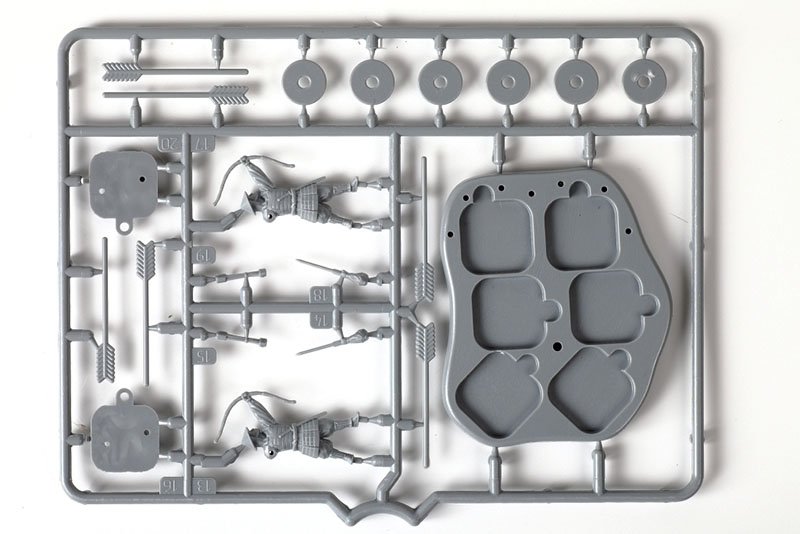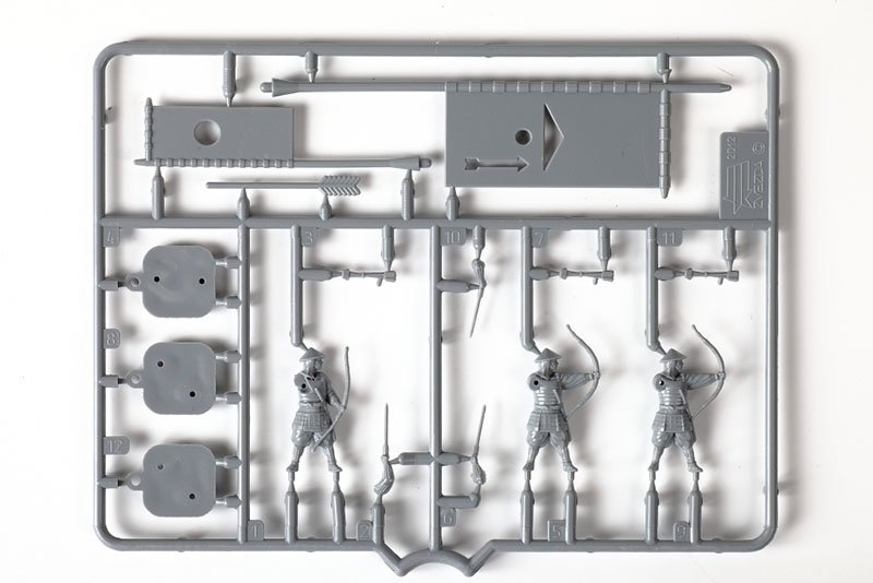 Асигару-лучники. В наборе пять фигур, три типажа. Позы выглядят очень реалистично, а проработка мелких деталей просто на высоте. Фигуры изготовлены с использованием технологии 3D-проектирования. В коробке, помимо фигурок, вы найдете подставки, флаги и два комплекта декалей для кланов Ода и Такеда.