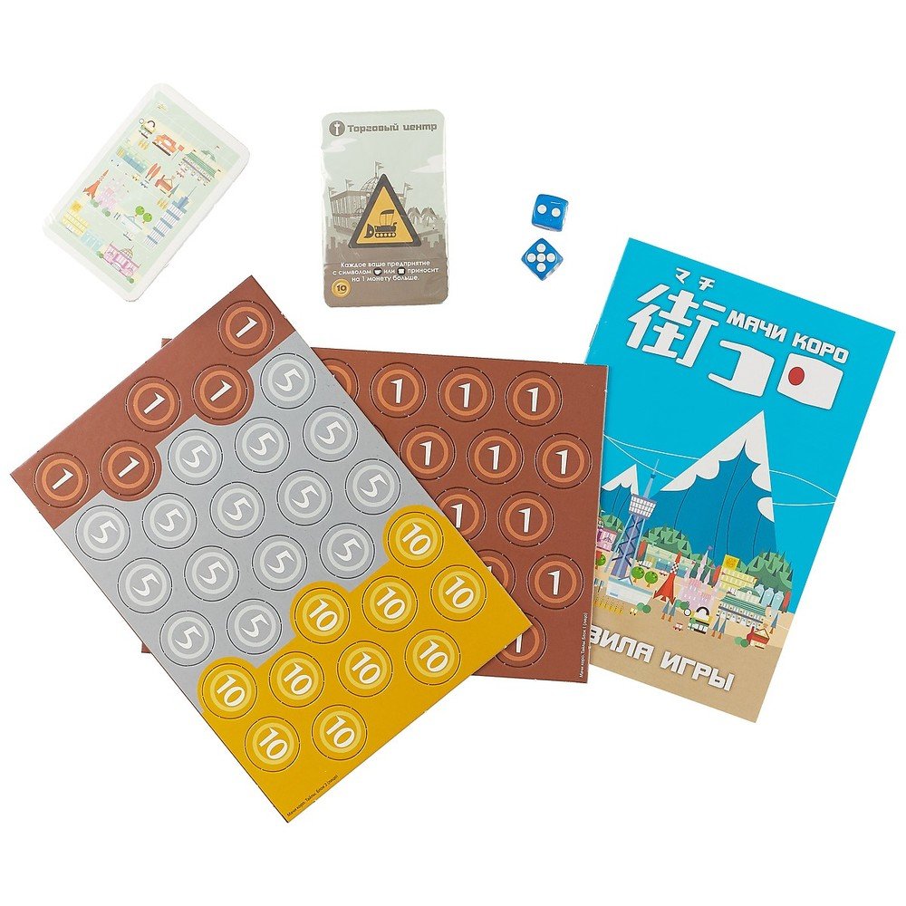 Настольная игра "Мачи Коро" – игра для 2-5 игроков, которые хотят окунуться в уютную Японию. Вы берёте на себя роль мэра маленького, но амбициозного городка. Как мэр, который любит свой город, вы хотите его процветания и развития. Стройте закусочные и аэропорты, украшайте улочки садами и достопримечательностями, а результат не заставит себя долго ждать. Но не забывайте, что близлежащие городки тоже не стоят на месте, и вам предстоит вступить в нешуточную борьбу за право провозгласить свой город лучшим!
